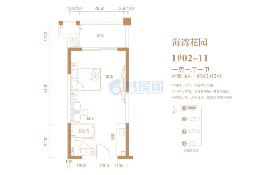 海湾花园项目5套酒店式公寓在售,建面为43.03-48.76平米一房户型,总价约72-74万/套