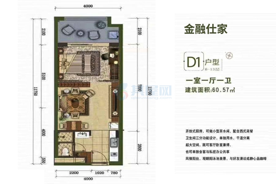 主力户型: (建筑面积)60.57㎡(一居)
