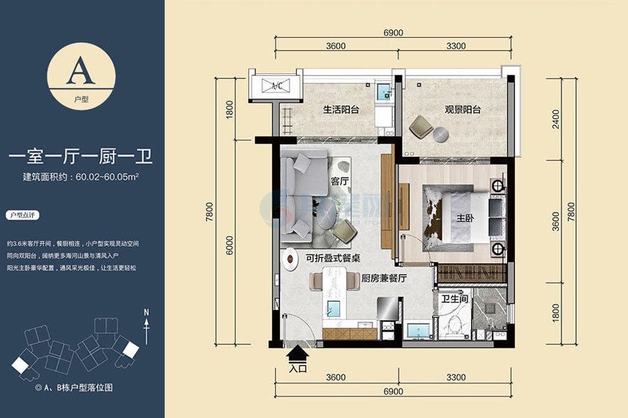 三亚·景园城位于三亚市天涯区凤凰路凯丰大酒店对面。目前项目A、B、C三种户型房源在售中,A户型建面约60.05-60.07平一房、A户型建面约68.33-98平两房、